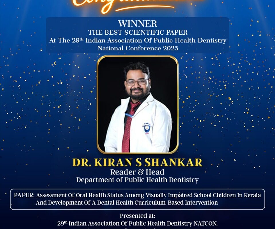 Congratulations to Dr. Kiran S Shankar, Reader & Head, Department of Public Health Dentistry, for winning The Best Scientific Paper Award at the 29th IAPHD National Conference 2025.