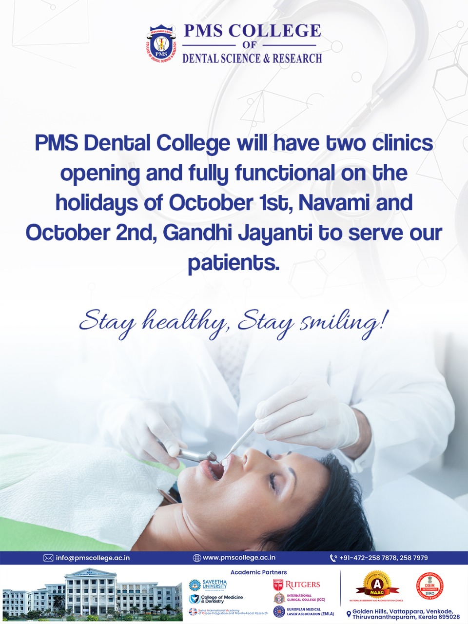 PMS Dental College hereby informs that both clinics will remain open and fully operational on 1 October (Navami) and 2 October (Gandhi Jayanti). We remain committed to providing timely and professional dental services.