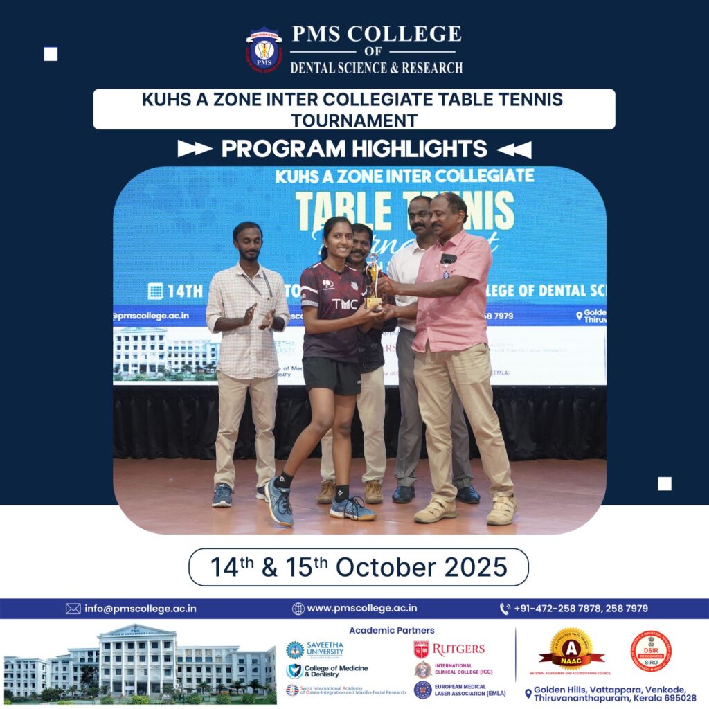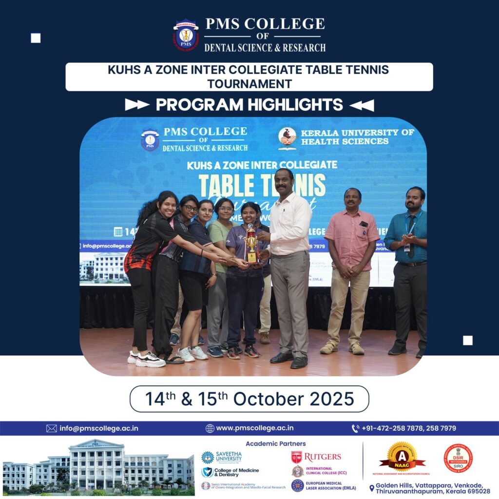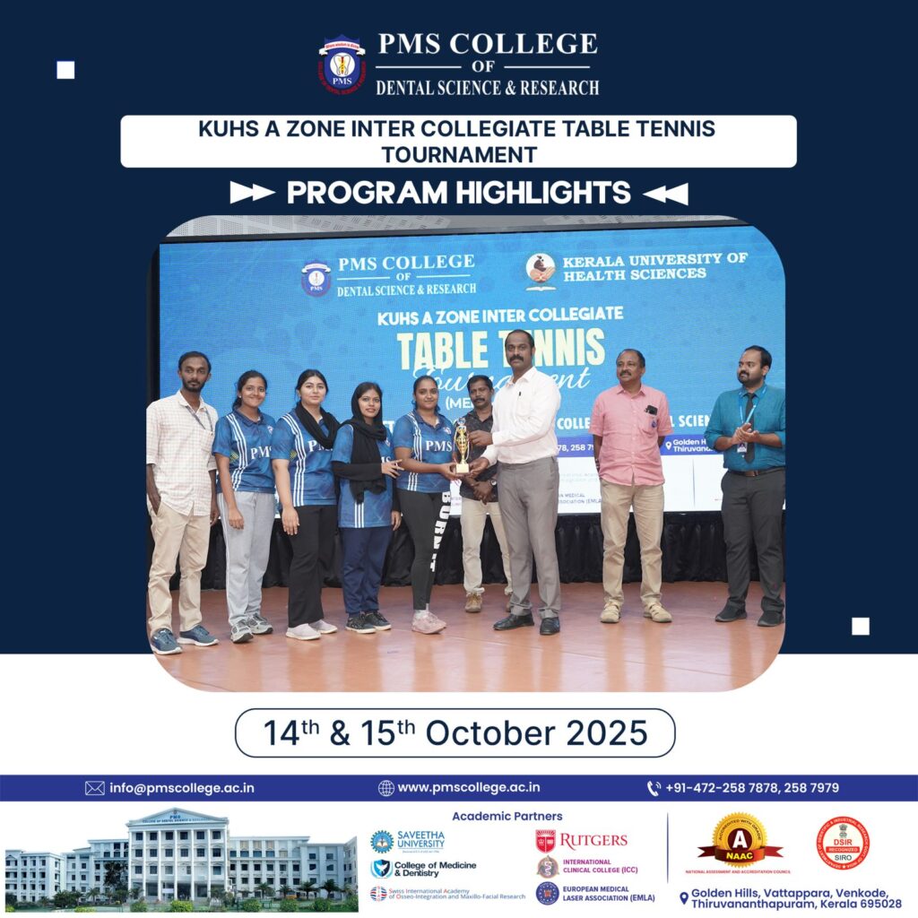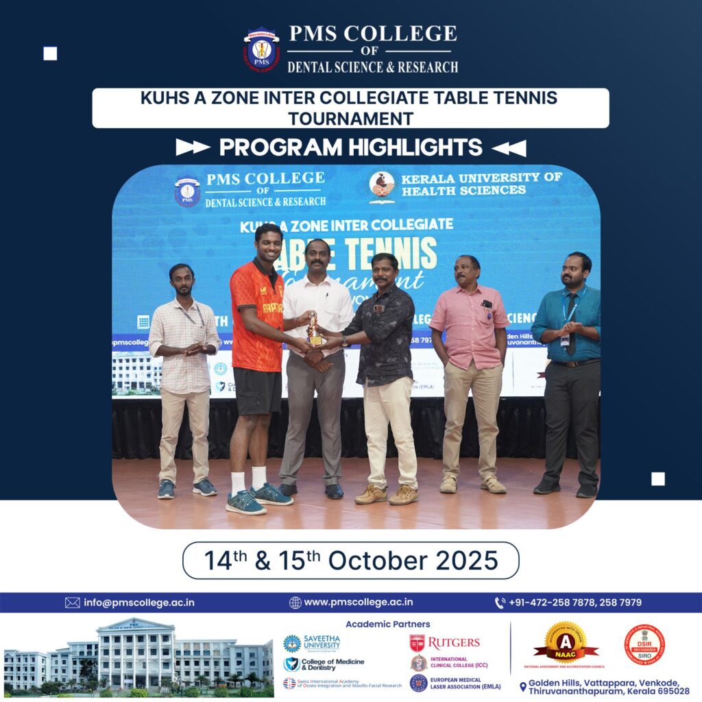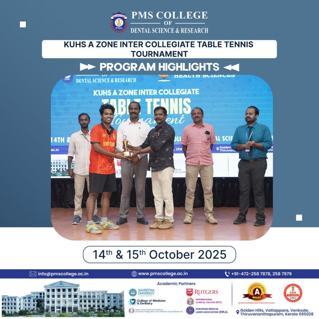 The KUHS A Zone Inter Collegiate Table Tennis Tournament was successfully hosted by PMS College of Dental Science & Research on 14th & 15th October 2025. 🏓