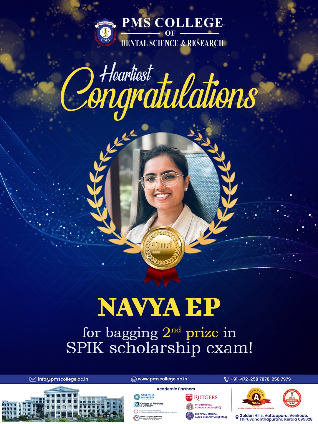 A big congratulations to Navya EP for winning 2nd Prize in the Society of Periodontists and Implantologists of Kerala (SPIK) Scholarship Examination.