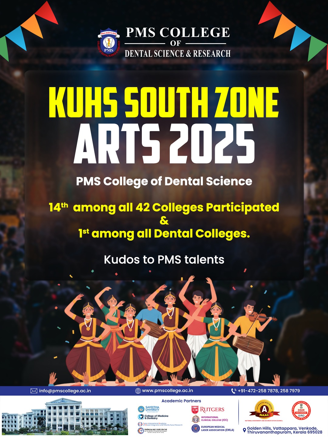 PMS College of Dental Science & Research shines bright at KUHS South Zone Arts 2025, securing 14th place among 42 colleges and ranking 1st among all dental colleges.